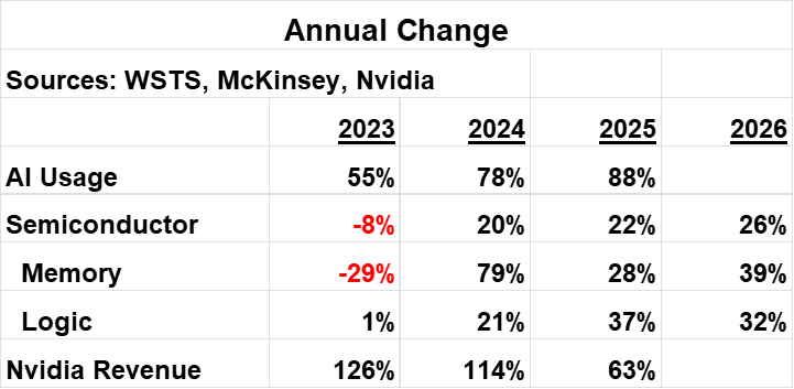 The WSTS December 2025 forecast called for 22% semiconductor market growth in 2025 and 26% in 2026, following 20% growth in 2024. This growth has been driven by the memory and logic categories. Memory is forecast to grow 28% in 2025 and 39% in 2026. Logic is predicted to grow 37% in 2025 and 32% in 2026. Excluding the memory and logic categories, the remainder of the semiconductor market declined 3% in 2024 and is projected to grow only 6% in 2025. The memory companies have all cited AI as their major growth driver in the last two years. Nvidia, the largest AI semiconductor company, grew its revenue 114% in 2024 and is guiding for 63% growth in 2025. Most Nvidia AI semiconductors are included in the logic category.